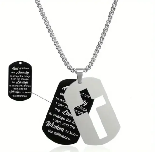 Detalles del productoColgante de doble chapa con la oración de la serenidad grabada. Un accesorio con un mensaje inspirador.