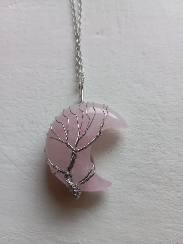 Colgante cuarzo rosa con Alambre Plateado y cadena