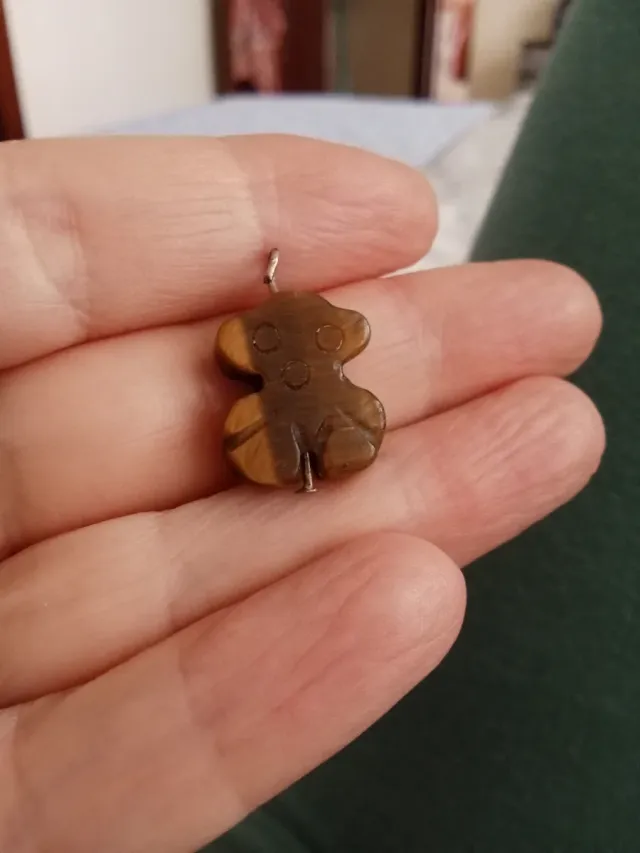 Detalles del productoColgante con forma de oso, tallado en piedra ojo de tigre. Ideal para añadir a tu colección de bisutería.
