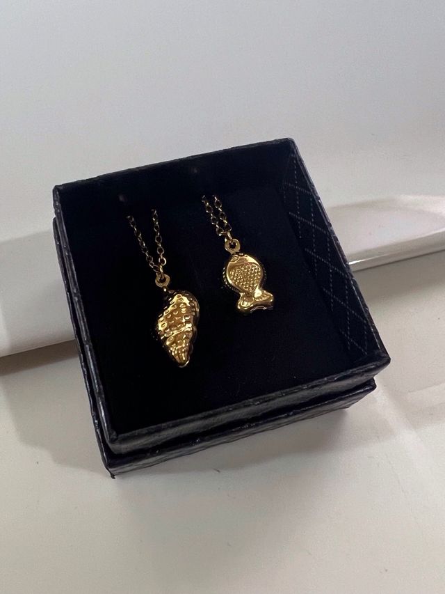 Colgantes dorados con forma de concha y pez