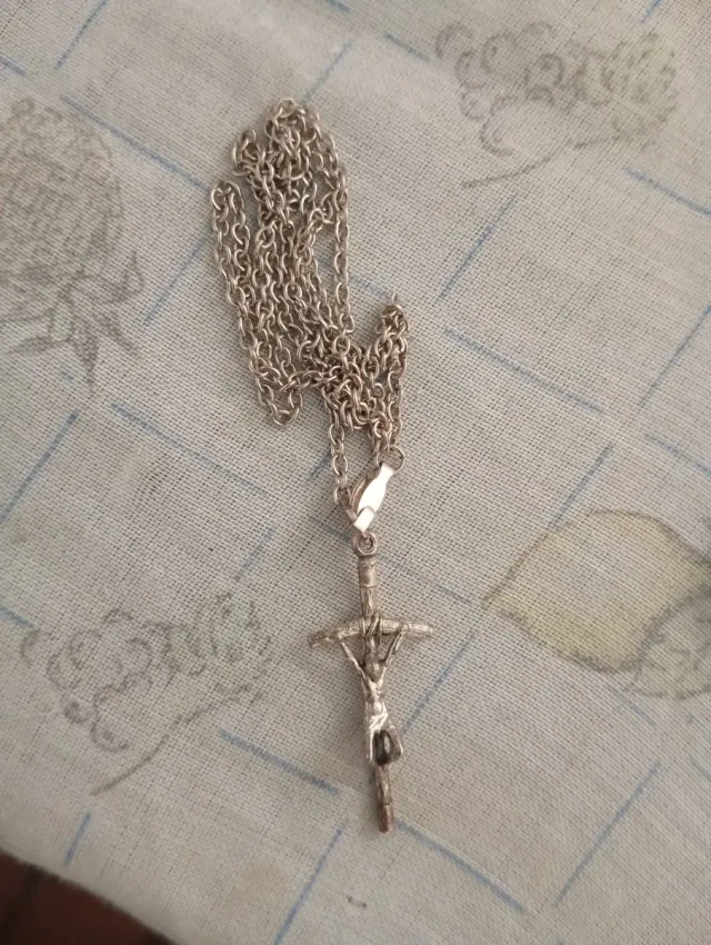 Elegante collar con un colgante de cruz. - Cadena de eslabones plateada. - Colgante detallado de la crucifixión.