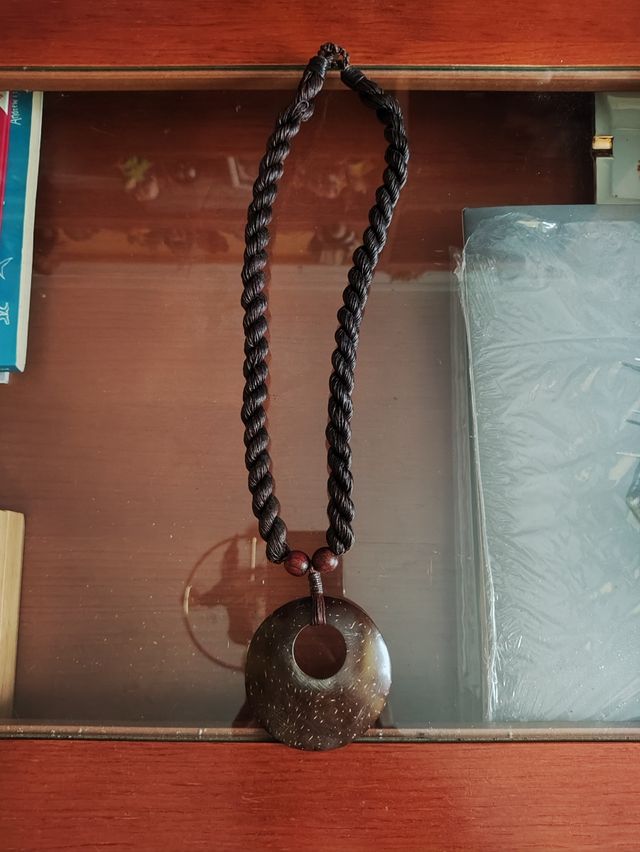 Collar de estilo tribal, cuerda de mimbre grueso y cáscara de coco pulido y barnizado. Mide aprox. 40cm de largo. Es de buena calidad.