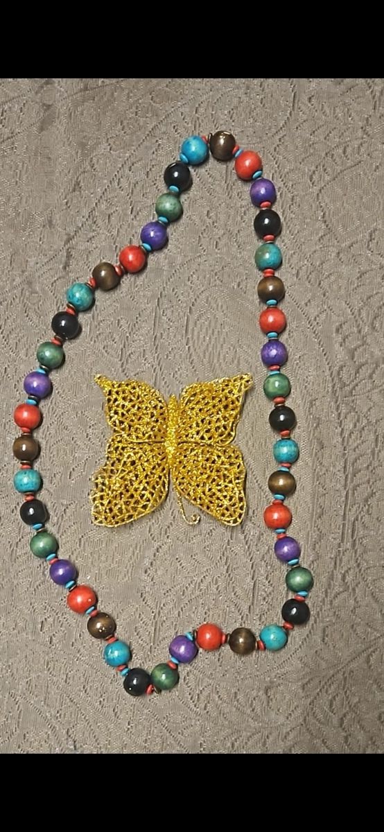 Detalles del productoConjunto de collar con cuentas de colores variados y un broche de mariposa.