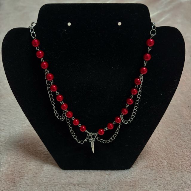Collar de perlas rojas y cadena con daga