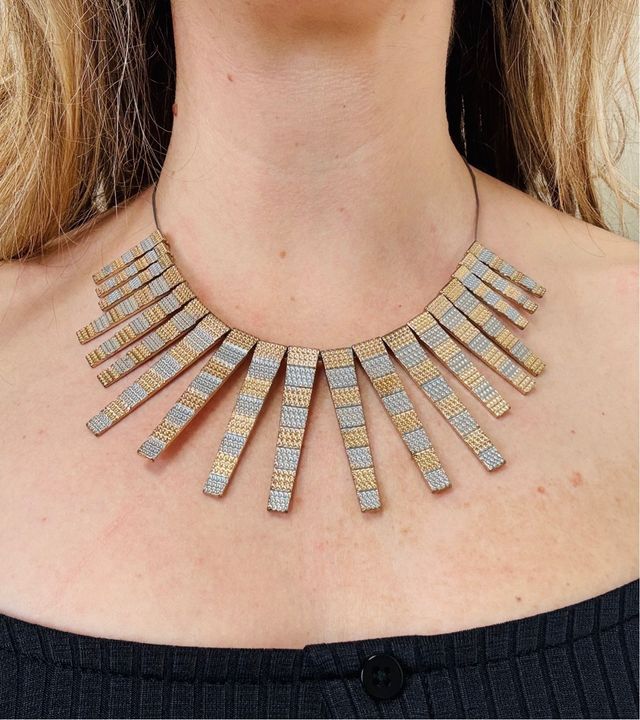 Elegante collar con un diseño único que combina tonos dorados y plateados. Su estilo moderno lo hace perfecto para complementar cualquier atuendo.