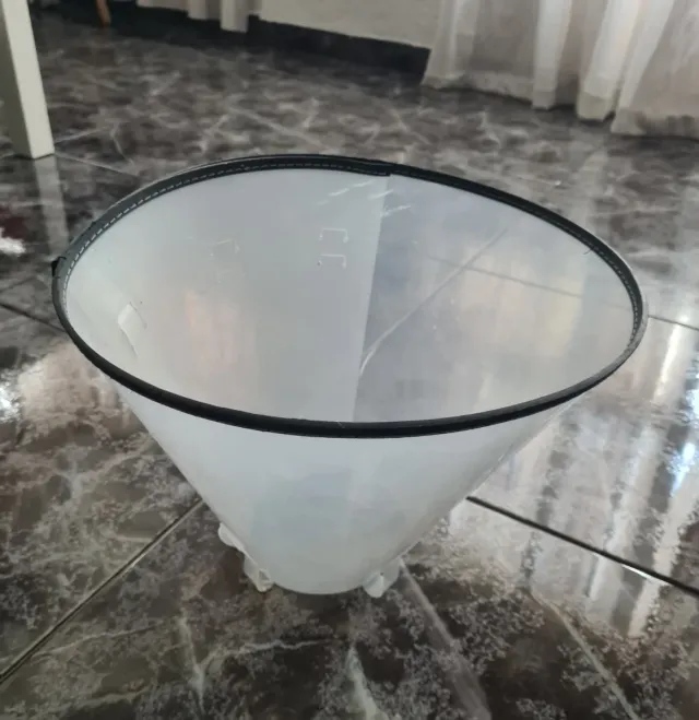 Detalles del productoCollar isabelino de recuperación para perros. Es transparente y tiene un borde de tela negra.