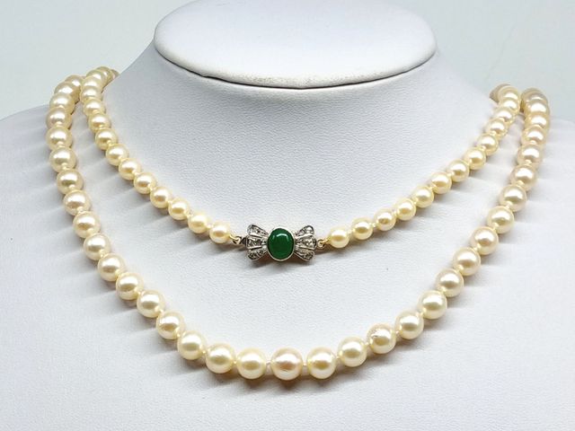 Collar antiguo, extralargo, con 129 perlas cultivadas japonesas de agua salada (no son perlas chinas ni imitación), esféricas, con diámetro de 5,90 a 8,90 mm.