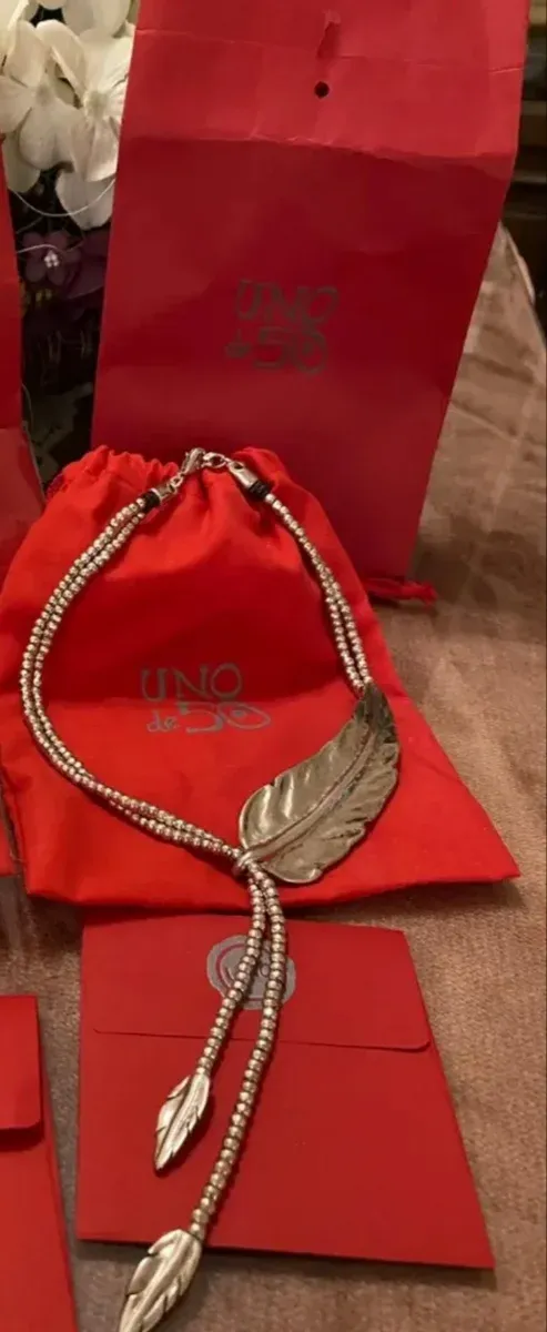 Detalles del productoCollar de la marca UNO de 50 con un diseño de hoja y dos colgantes en forma de pluma. Incluye su certificado de autenticidad.