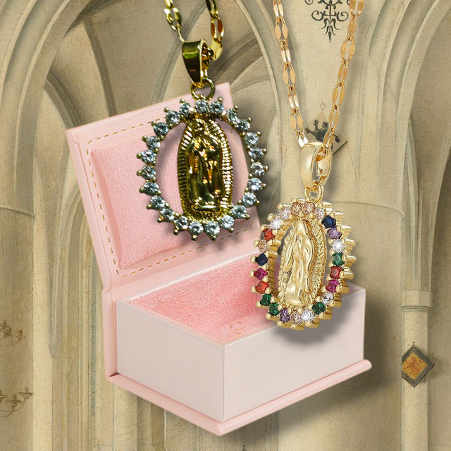 Detalles del producto Conjunto de 2 collares con colgante de la Virgen Milagrosa, rodeados de circones.