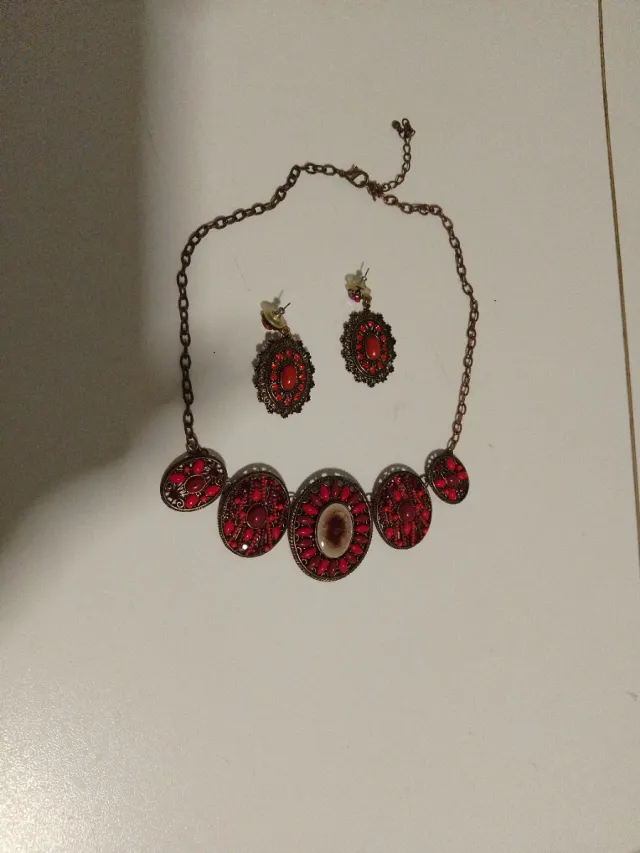 Collar y pendientes dorados con piedras rojas