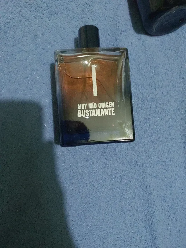 Perfume Muy Mio Origen de Bustamante. - Fragancia masculina. - Envase de cristal con detalles en azul y marrón.