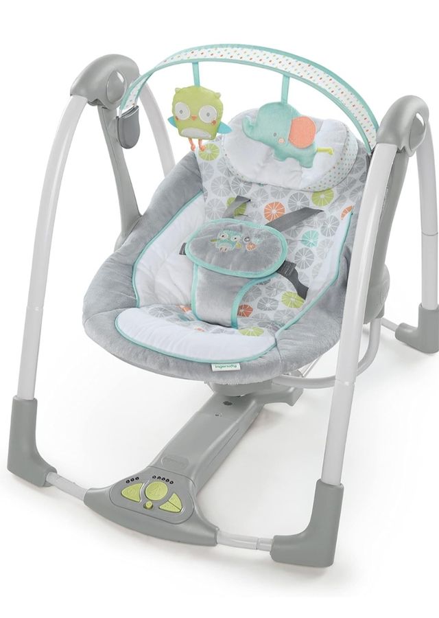 Detalles del productoIngenuity, Columpio Compacto Plegable Hugs & Hoots, 5 velocidades de balanceo, hamaca con 8 melodías y 3 sonidos de naturaleza, arco de juego extraíble, desde recién nacido hasta los 9 kg.