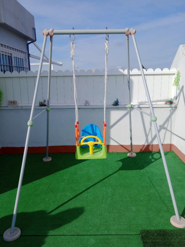 Detalles del productoColumpio infantil para bebé, ideal para jardín o terraza. Tiene dos asientos uno para cuando es bebé y el otro para más mayor.