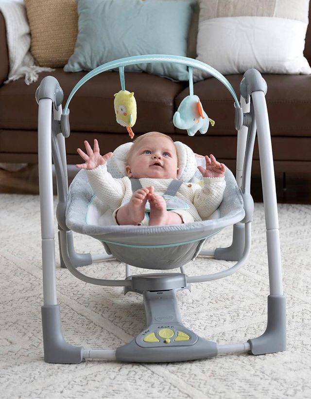 Detalles del productoIngenuity, Columpio Compacto Plegable Hugs & Hoots, 5 velocidades de balanceo, hamaca con 8 melodías y 3 sonidos de naturaleza, arco de juego extraíble, desde recién nacido hasta los 9 kg.