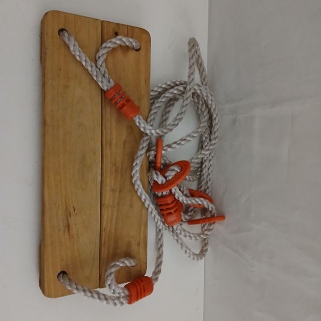 Se vende columpio de madera para niños. Es de madera clara y tiene cuerdas resistentes. - Ideal para niños pequeños. - Incluye cuerdas y enganches de plástico naranja. - Listo para instalar.