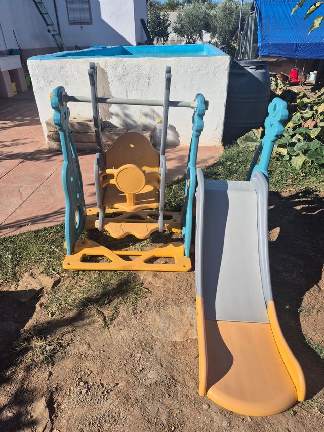 - Estructura de plástico resistente en tonos azul y amarillo.