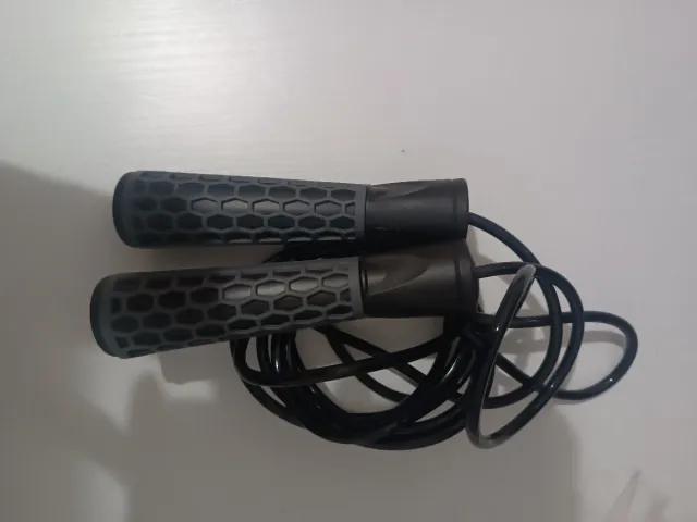 Comba de gimnasio con un diseño moderno y funcional. - Mangos ergonómicos con textura antideslizante. - Cuerda negra de PVC. - Ideal para entrenamientos cardiovasculares.