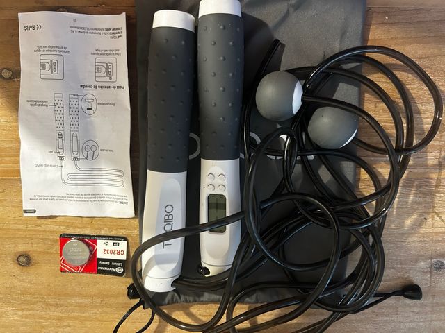 Detalles del productoComba o cuerda de saltar electrónica de la marca TOQIBO. Incluye dos asas con pantalla digital y dos pesas.