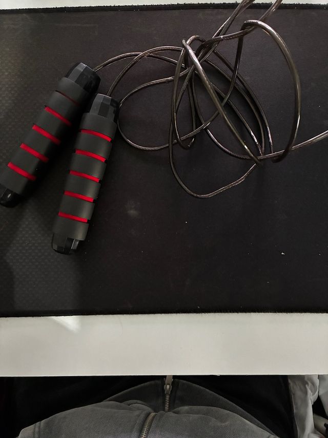 Comba de entrenamiento con mangos ergonómicos. - Mangos de goma negra con detalles rojos. - Cuerda de PVC negra.