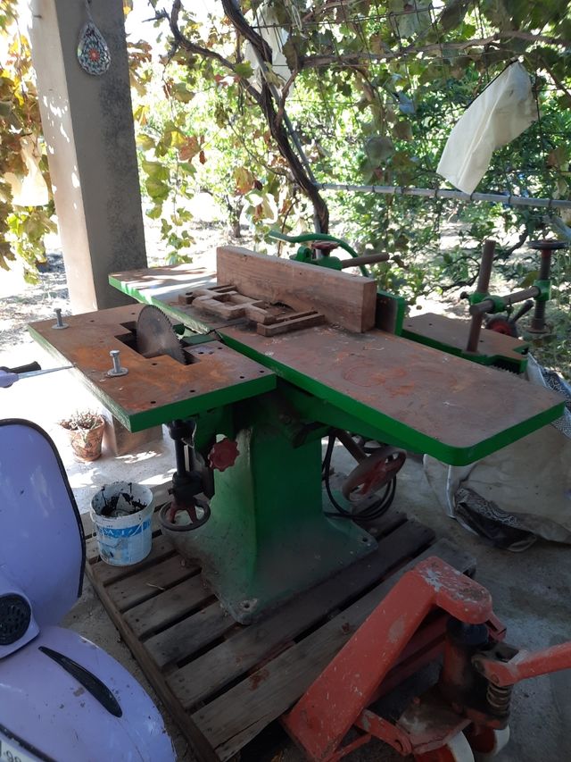 Máquina combinada para carpintería. - Estructura metálica verde. - Mesa de trabajo con sierra. - Incluye guía de corte.