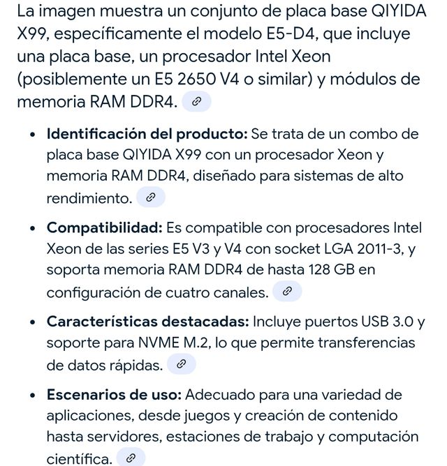Detalles del productoSe vende combo placa base QIYIDA X99 E5-D4. Incluye procesador Intel Xeon (posiblemente un E5 2650 V4 o similar) y módulos de memoria RAM DDR4. - Compatible con procesadores Intel Xeon series E5 V3 y V4 con socket LGA 2011-3. - Soporta hasta 128 GB de RAM DDR4 en configuración de cuatro canales. - Incluye puertos USB 3.0 y soporte para NVME M.2 para transferencias rápidas de datos. - Perfecto para juegos, creación de contenido, servidores, estaciones de trabajo y computación científica. El conjunto se encuentra en buen estado.
