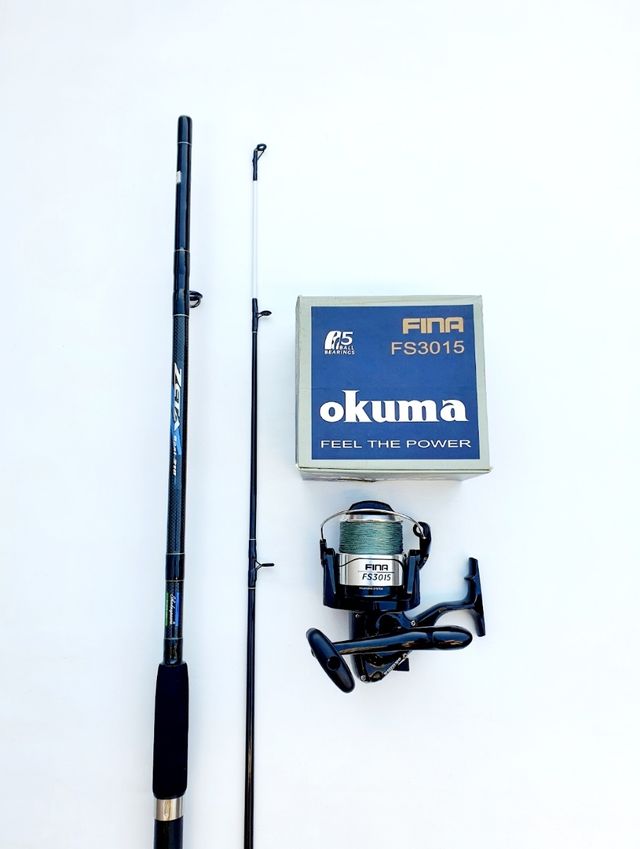 Detalles del productoCOMBO diseñado para la pesca del siluro a spinning y a fondo y para pescar desde embarcación a currican y al vivo. COMPUESTO POR CAÑA ZETA DE 2.10 METROS, DE CARBONO, CON EL ANILLADO REFORZADO Y ACCIÓN 300-500 GR + CARRETE OKUMA FINA en talla 5500, 5 RODAMIENTOS, Y CUERPO ANTICORROSIVO DE GRAFITO DE TITANIO + 300 METROS DE TRENZADO YUKI DEL 0.45