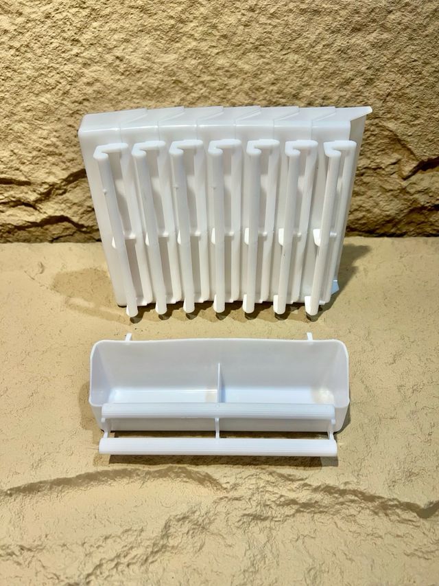 Comedero de plástico súper resistente, ideal para todo tipo de jaulas. Su diseño con ganchos traseros permite colocarlo fácilmente en los barrotes.