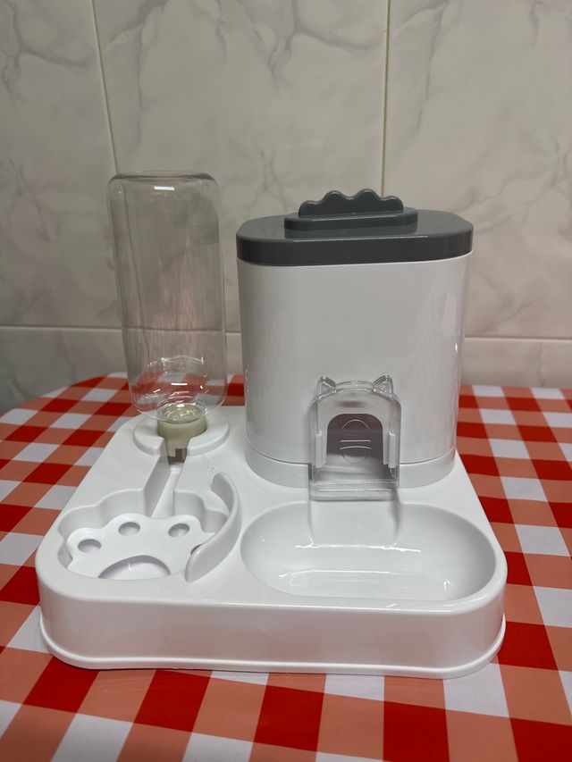 Detalles del productoDispensador de comida y agua para mascotas. Ideal para mantener a tu compañero alimentado e hidratado.