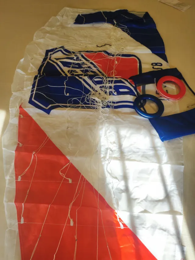 Cometa de tela con el logotipo de Brugal en rojo, blanco y azul. Incluye las asas para un mejor agarre y una bolsa para guardarla con instrucciones. Mide 2 metros por 75.