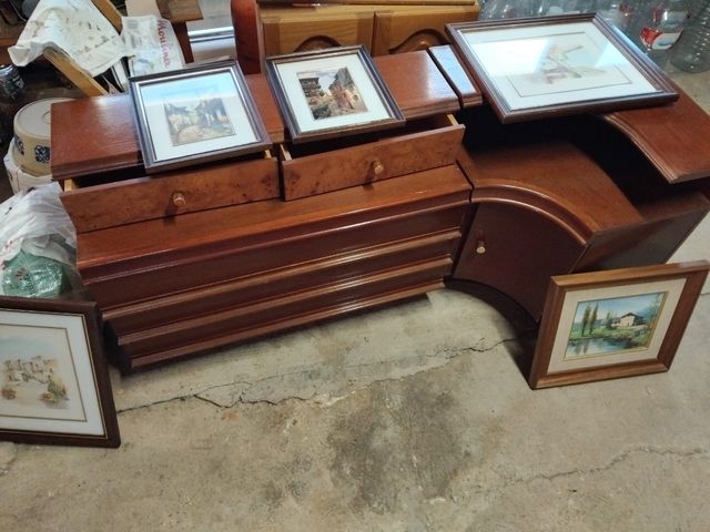 Detalles del productoPreciosa colección de muebles antiguos. Incluye un elegante espejo con marco de madera, una cómoda rinconera y un comodín.