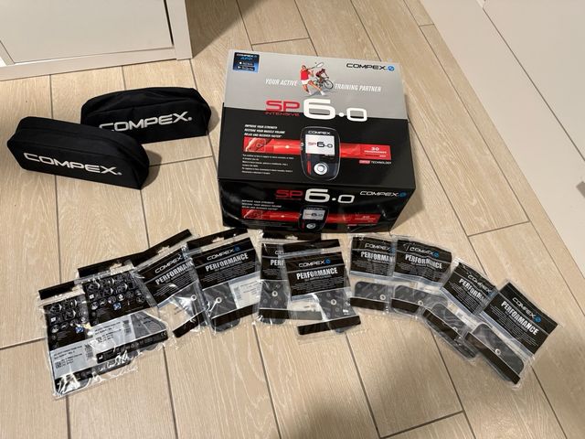 - Incluye varios paquetes de electrodos tanto de Compex como otros compatibles. Además del cableado (se puede ver que no tiene uso) y su caja.