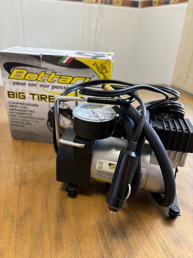 Detalles del productoCompresor de aire para coche de la marca Bottari, ideal para inflar neumáticos.