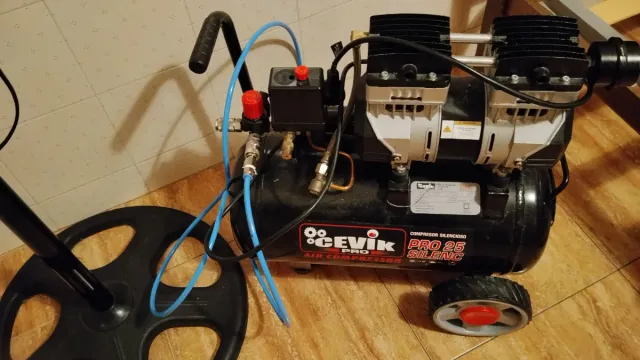 Compresor de aire Cevik Pro 25, modelo silencioso. - Diseño compacto y portátil. - Asa para facilitar el transporte. - Ruedas para movilidad.
