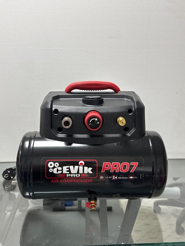 Compresor de aire Cevik Pro7, compacto y portátil. - Capacidad del depósito: 6 L. - Potencia: 1,5 HP. - Caudal de aire: 160 L/min. Como nuevo con caja original !!