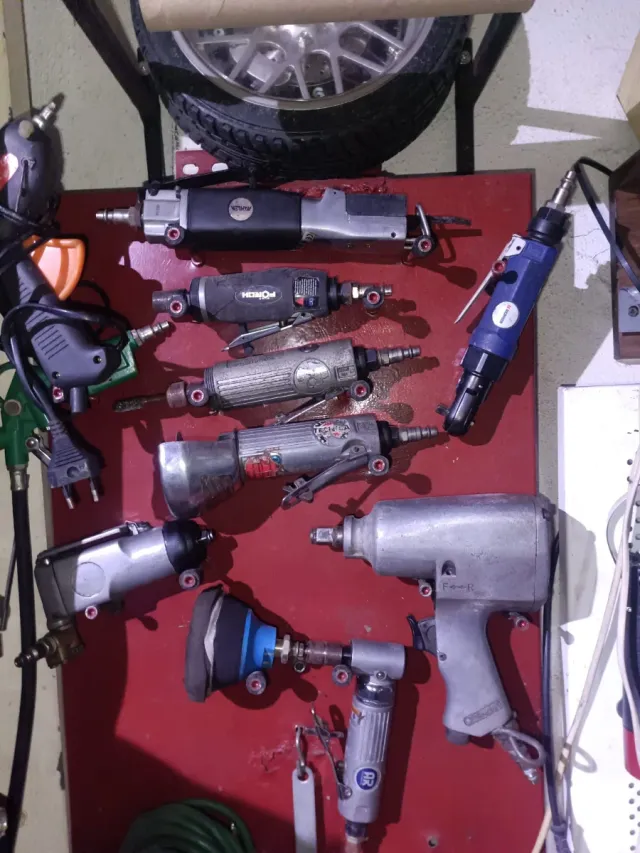 Detalles del productoLote de herramientas neumáticas que incluye compresor de aire, manguera y varias pistolas.