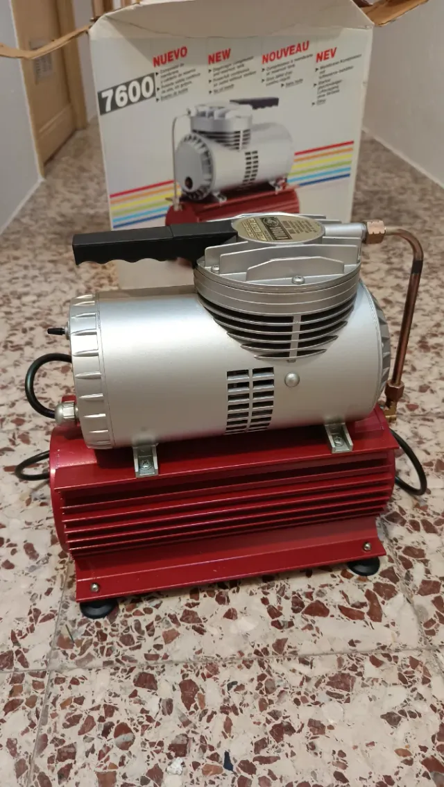 Detalles del productoCompresor de aire plateado y rojo hecho en España, estaba guardado en un trastero desde que se compró, no se ha llegado a usar, como se ve en las fotos esta nuevo.