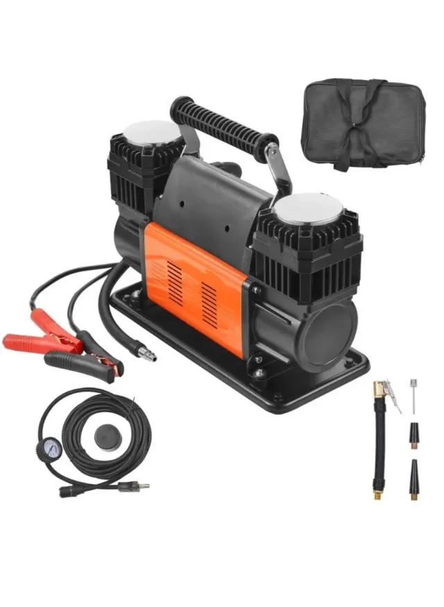 Detalles del productoCompresor de aire portátil doble piston de 12V, ideal para inflar neumáticos grandes 4x4 , coche moto, o bicicleta. Incluye accesorios.