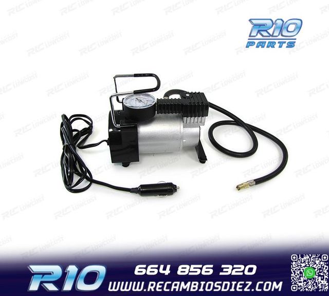 Detalles del productoMóvil: 664 856 320 - Referencia: RLC146016. COMPRESOR DE AIRE 12V Voltaje: 12V Capacidad: 12 BAR Potencia Máxima: 18 BAR / 250 PSI Caudal: 4,5 L/MIN Consumo máximo de corriente: 10 A Incluye: Cable de alimentación de 3 metros conector para encendedor. 43cm de manguera de aire con válvula de cierre rápido.