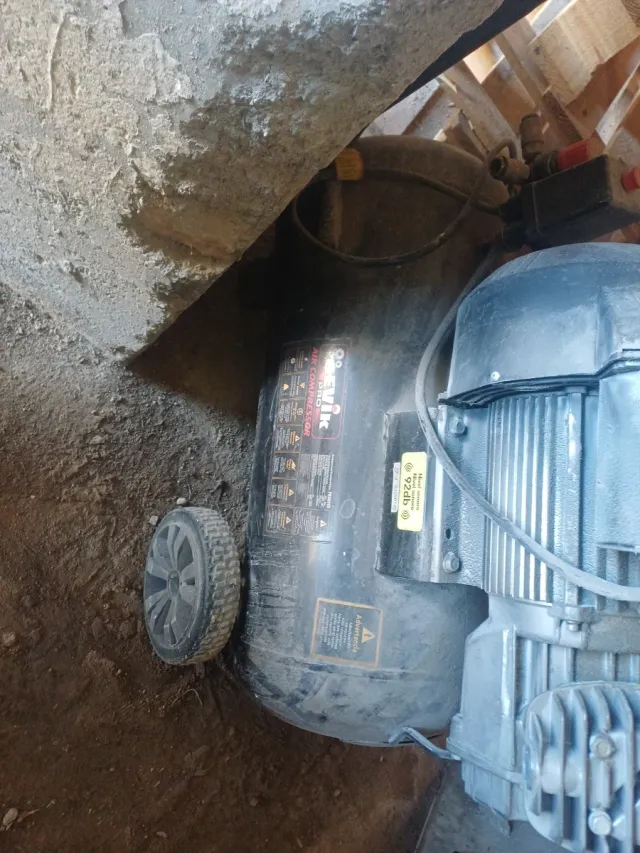 Compresor de aire con tanque. - Ruedas para fácil transporte. - Etiqueta de advertencia visible.