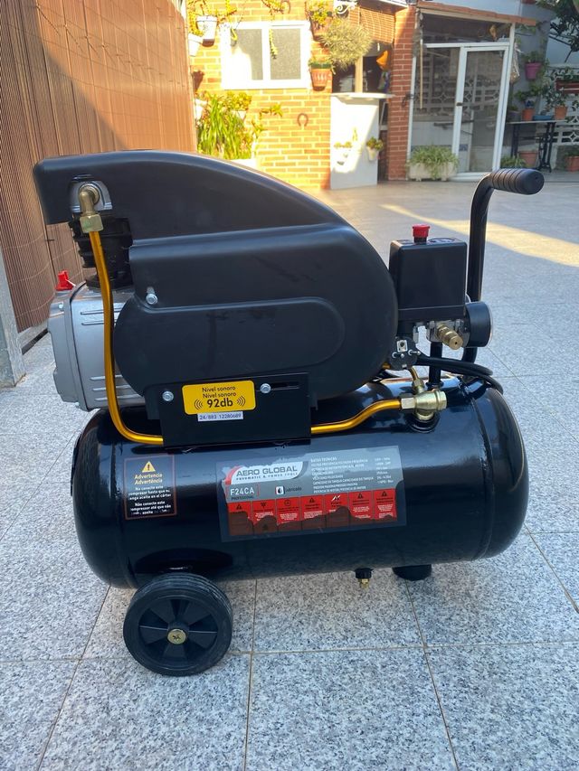 Compresor de aire Aero Global, modelo F24CA, con un nivel sonoro de 92db. - Capacidad del tanque: 24L. - Presión máxima: 8 bar. - Potencia: 2 HP. - Lubricado.