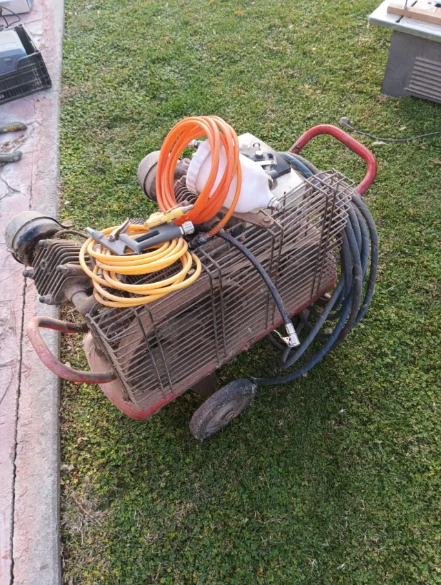 Compresor de aire con mangueras y pistola. Funciona perfectamente . Está un poco sucio de estar guardado. A recoger el Fuentelsaz de Jarama.