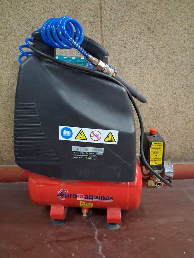.Compresor con poco uso y manguera nueva de 6 litros 1,5hp - Modelo: 250VAC 5A - Presión Máx: 115PSI - Incluye manguera en espiral azul.