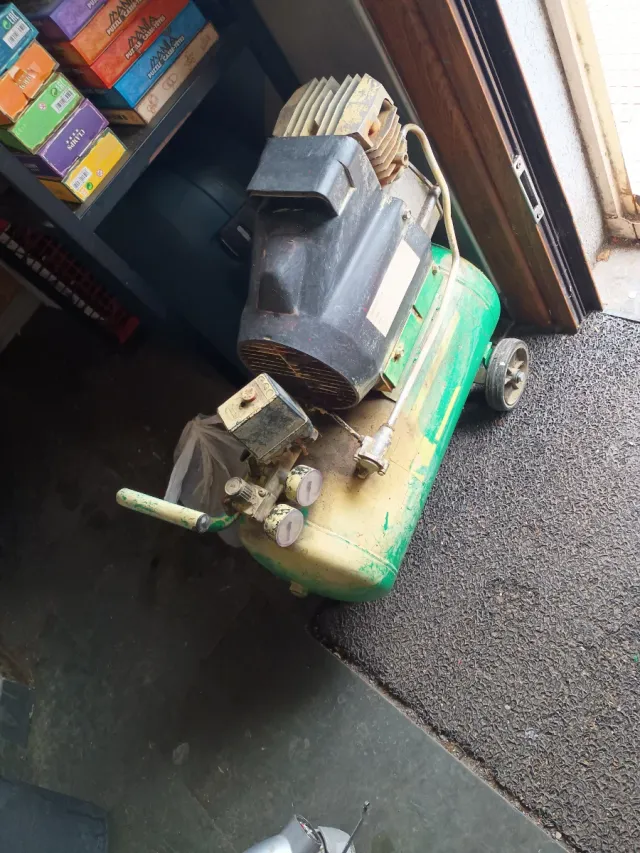 Detalles del productoCompresor de aire de color verde y amarillo. Cuenta con ruedas para facilitar su transporte y un manillar.