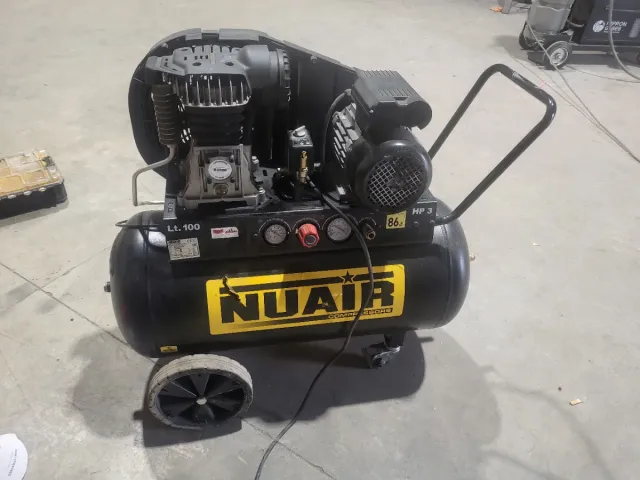Compresor de aire NUAIR con depósito de 100 litros y motor de 3 HP. Ideal para diversas tareas.