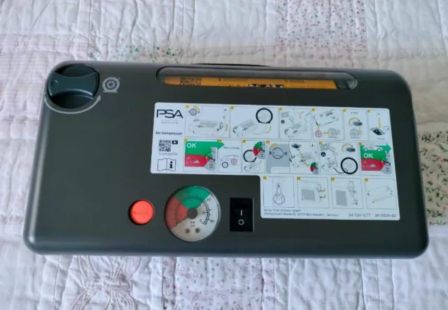Detalles del productoCompresor de aire de la marca PSA, diseñado para su uso en automóviles. Incluye un manómetro para controlar la presión.