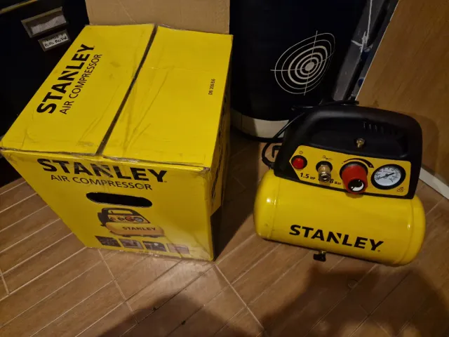 Detalles del productoCompresor de aire Stanley de color amarillo y negro, con una potencia de 1.5 HP y capacidad de 8 Bar. Incluye su caja original.