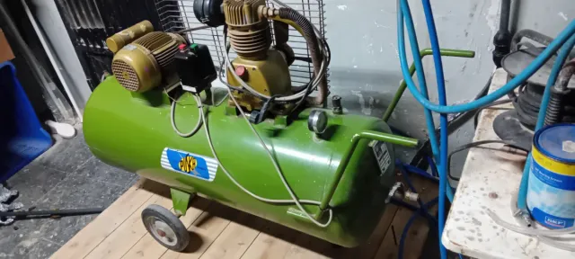 Detalles del productoCompresor de aire de color verde con ruedas para facilitar su movilidad. Incluye un manómetro para controlar la presión.