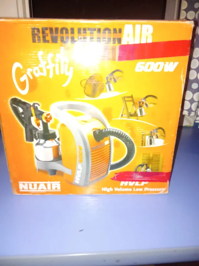 Detalles del productoCompresor de pintura portátil marca NU AIR, modelo Revolution Air.