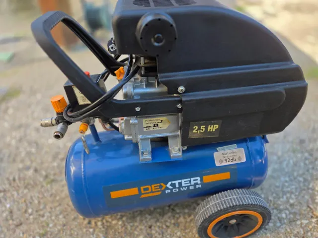 Detalles del productoCompresor de aire Dexter de 24 litros y 2.5 HP. Con accesorios varios.