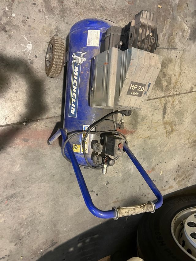Compresor de aire comprimido de la marca Michelin. - Modelo HP 2.0 Peak. - Color azul. - Ruedas para facilitar el transporte.